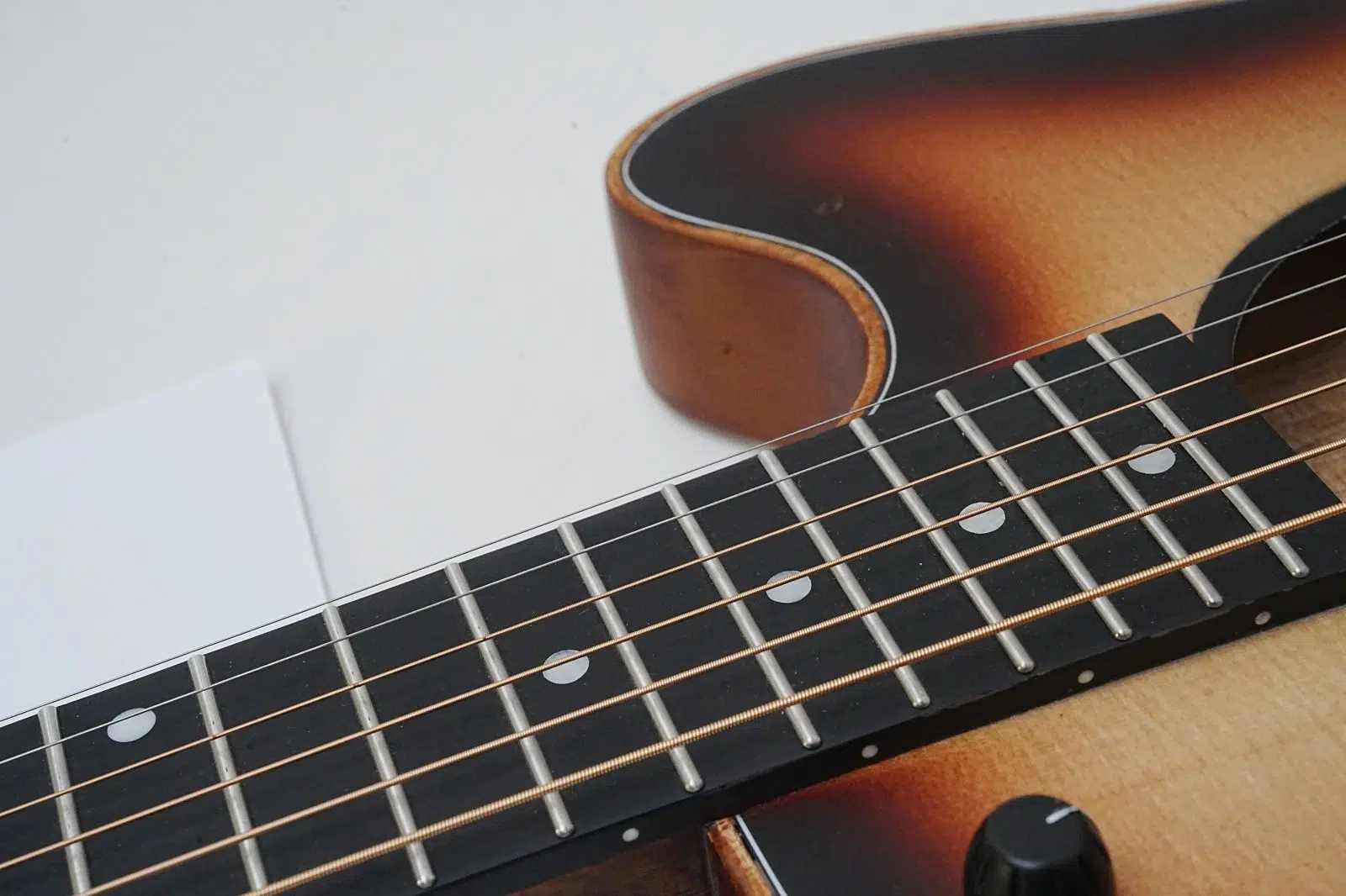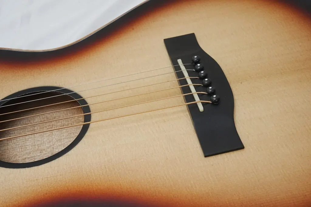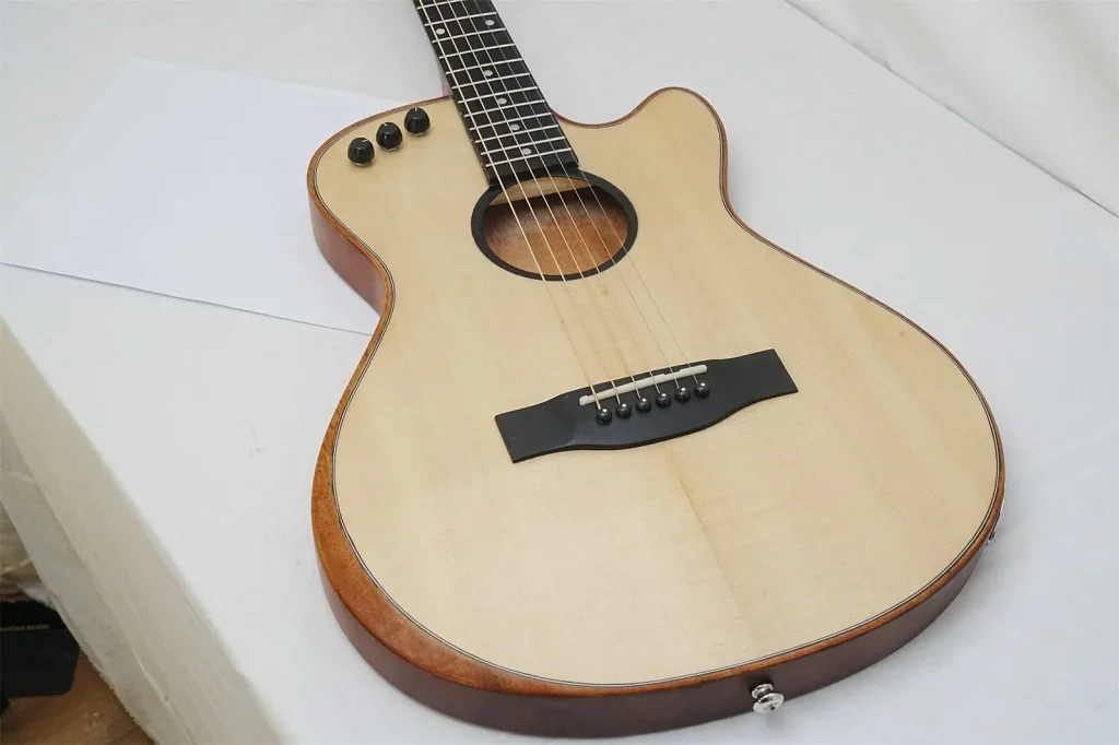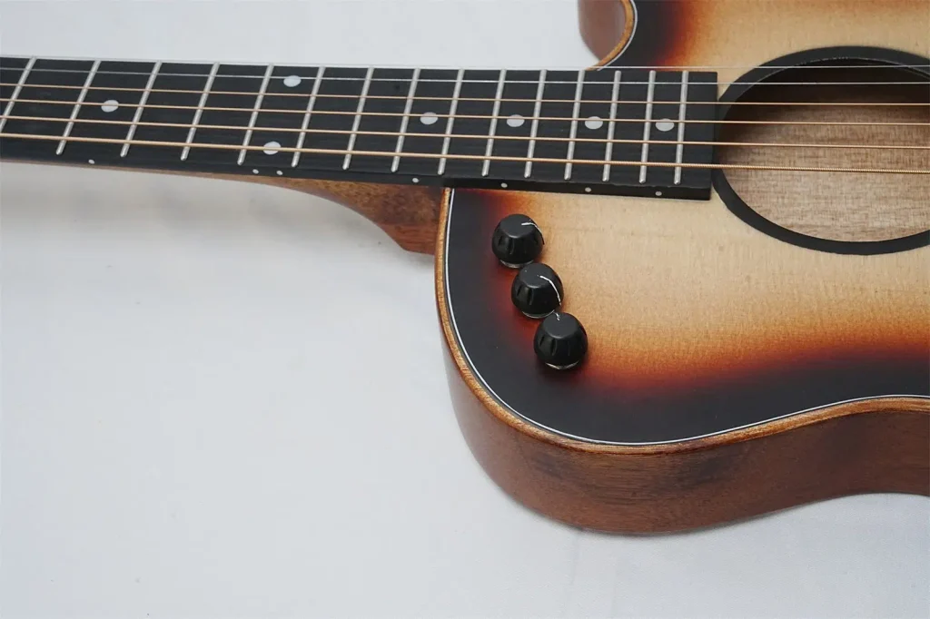 his 40-inch thin body guitar embodies professional quality with its excellent configuration. The spruce solid top delivers a bright and clear sound, providing rich resonance and a solid foundation for tone. The Okoume back and sides, paired with the same material fingerboard, offer a warm texture that adds natural warmth to the sound, creating a harmonious tonal layer with the spruce top. The wood binding design outlines an elegant contour, enhancing the stability of the body while adding a vintage charm. The tech wood fingerboard has moderate hardness and strong stability, paired with stainless steel round-head frets for smooth playability without finger scraping, maintaining a new feel even after prolonged use. The rosewood bridge accurately transmits tone, combined with cow bone nut and saddle, allowing notes to resonate long and clearly. The simple and practical 1V 1T control knobs easily adjust volume and tone details. The standard steel strings have moderate tension, suitable for pop and folk performances; they can also be replaced with nylon strings for classical styles, catering to diverse playing needs. The chrome hardware has an outstanding texture, and the matte finish is understated yet durable, balancing aesthetics with practicality. Whether for beginners practicing or advanced players performing daily, this guitar offers balanced performance, accompanying you to explore the infinite possibilities of music.