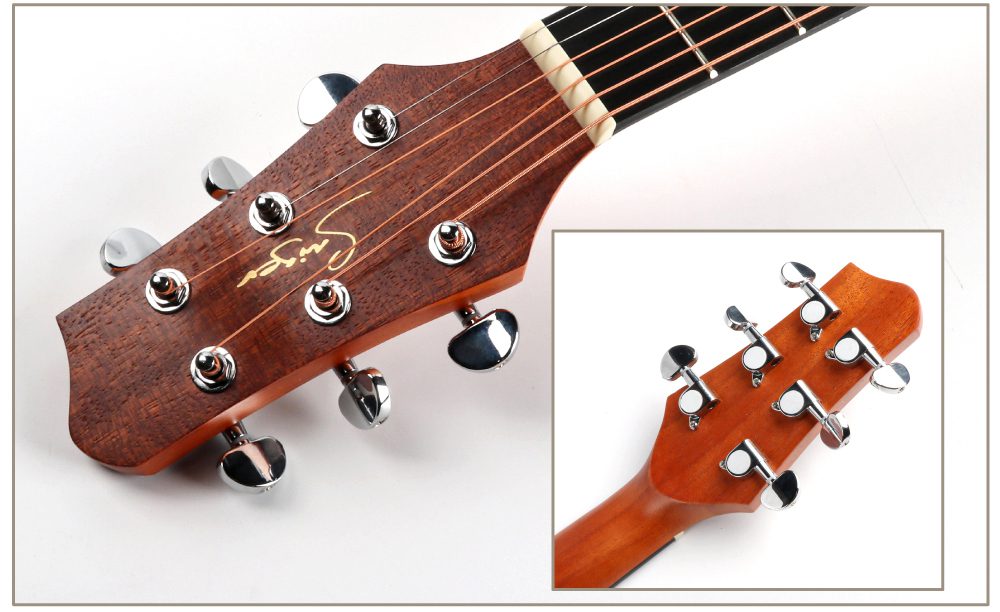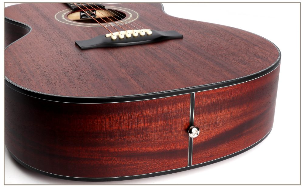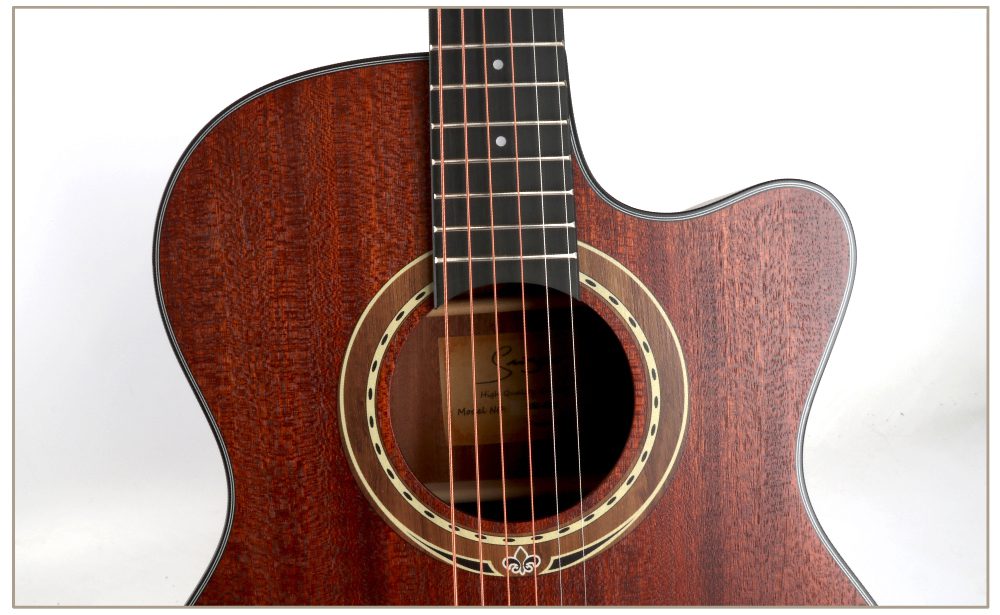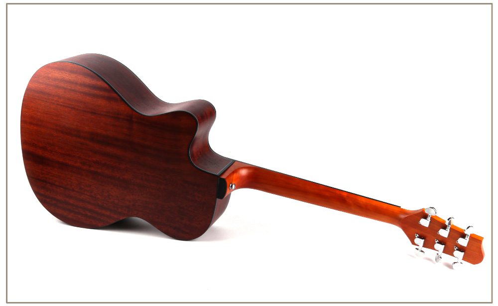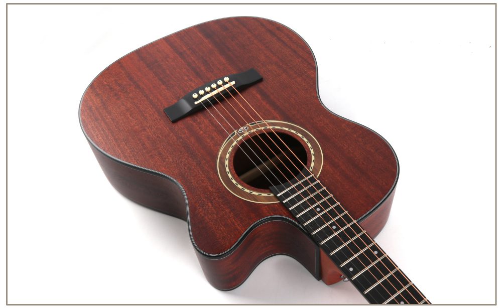 The top, back and sides are all made of mahogany, with natural and smooth texture and warm and charming tone. Mahogany gives this guitar a mellow and full tone, with bright and penetrating treble, warm and emotional midrange, and deep and elastic bass. The technical wood fingerboard is sturdy and durable, providing stable support and comfortable feel for your performance. The ABS edging not only increases the durability of the guitar, but also adds exquisite details to its appearance. Overall, this guitar shows extraordinary quality both in terms of sound quality performance and appearance design, which can satisfy your pursuit and love of music.