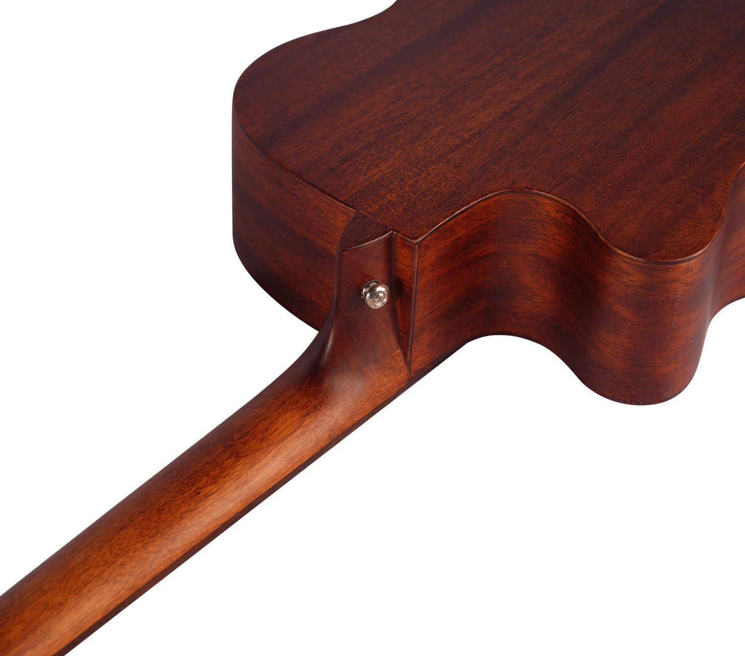 The panel is made of spruce veneer, with fine texture and rich texture. Spruce veneer has excellent resonance characteristics, which can make the tone purer and brighter. Whether it is crisp arpeggios or passionate strumming, it can show rich layering. The back side is mahogany. This material endows the guitar with warm and mellow mid-low frequencies, making the sound fuller and rounder. The neck is made of okoume, which is strong and durable and provides stable support for playing. The fingerboard is rosewood. Not only is it elegant in appearance, but it also brings a comfortable playing feel and allows your fingers to dance freely on it. The design of 20 frets greatly expands the possibility of playing.